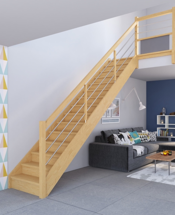 Escalier droit en hévéa LCA, avec contremarches et structure limon. Main courante rectangulaire en bois et lisses en aluminium anodisé mat de Ø 18 mm. Garde-corps étage en panneaux PLB (panneau bois haute densité teinté gris) entre lisses bois, marche de départ droite. Finition vernis incolore.