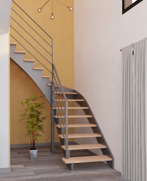Escalier 1/4 tournant milieu en hêtre et chêne massif, sans contremarches et structure Crémaillère Décalée (CD). Main courante et poteaux en fer plat, lisses de Ø 18 mm en métal thermolaqué (gun métal). Marche de départ saillante. Finition peinture (gun métal) et vernis incolore.