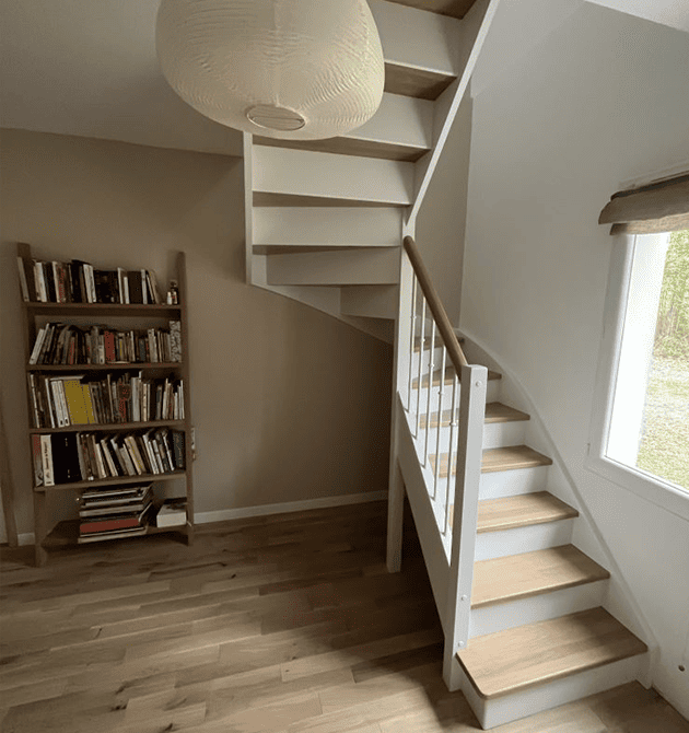 Escalier peint en blanc tout en conservant un côté naturel avec les marches et les mains courantes en vernis incolore.