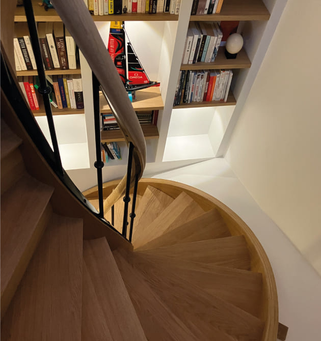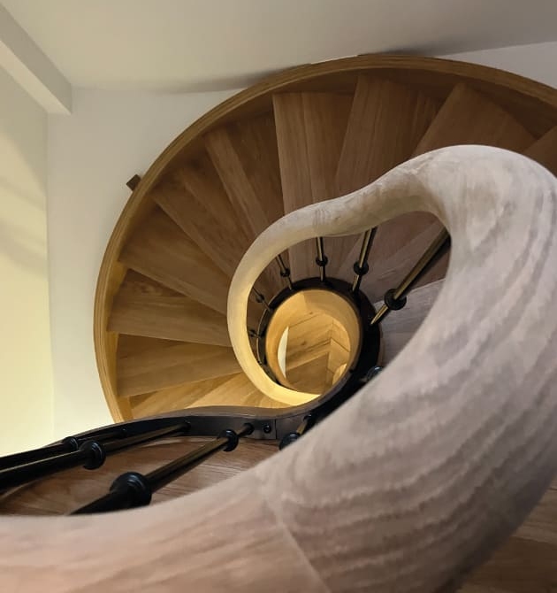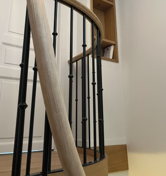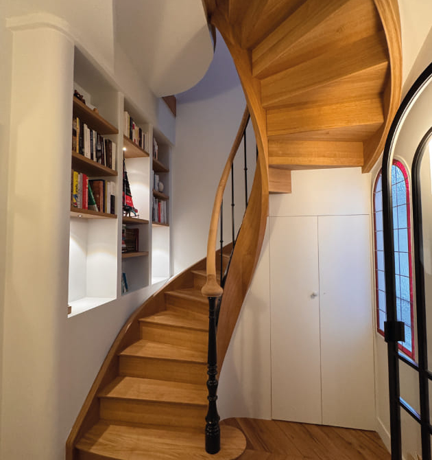 Un escalier et une main courante entièrement débillardés en chêne massif, conçus pour épouser parfaitement les courbes de ce lieu chargé d’histoire.