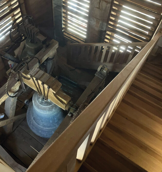 🪵Un ouvrage unique : escalier sur limon avec balustres en bois (iroko brut), pensé pour épouser l’architecture délicate du clocher et contourner les cloches en place.