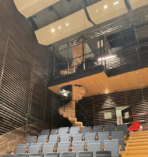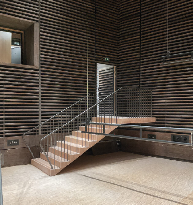 Le garde-corps en métal noir contraste élégamment avec les marches en bois clair, renforçant la sensation de légèreté. Chaque détail a été pensé pour s’intégrer harmonieusement dans l’acoustique et l’atmosphère unique de ce lieu.