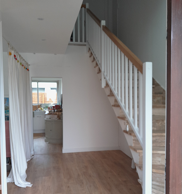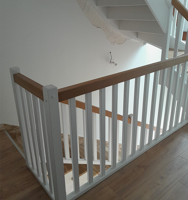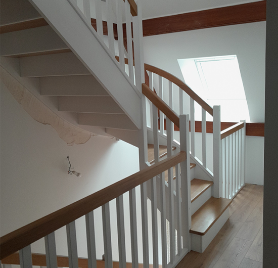 - Essence de bois : Marches et mains courantes en Chêne massif (finition vernis incolore) pour la noblesse du grain, structure et balustres en hêtre laqué blanc (RAL 9016)
