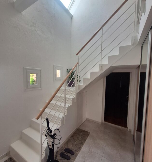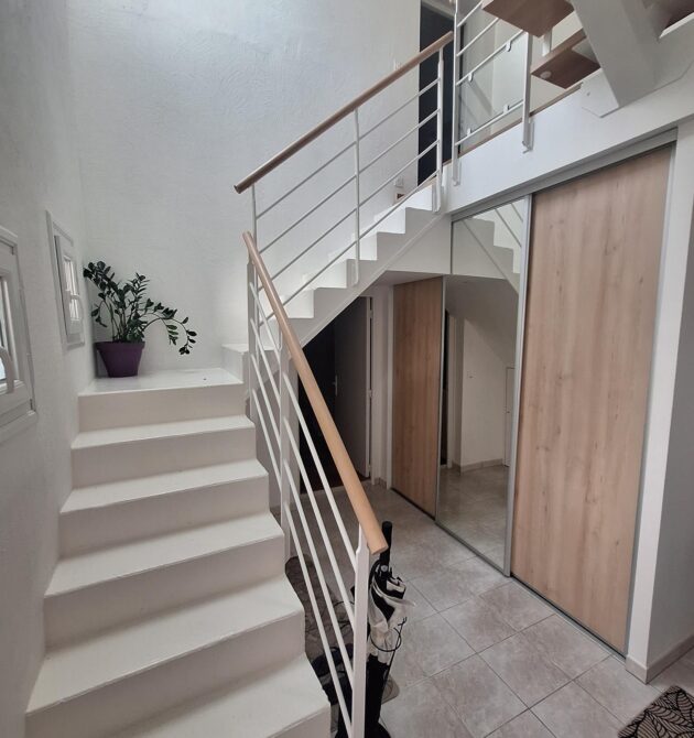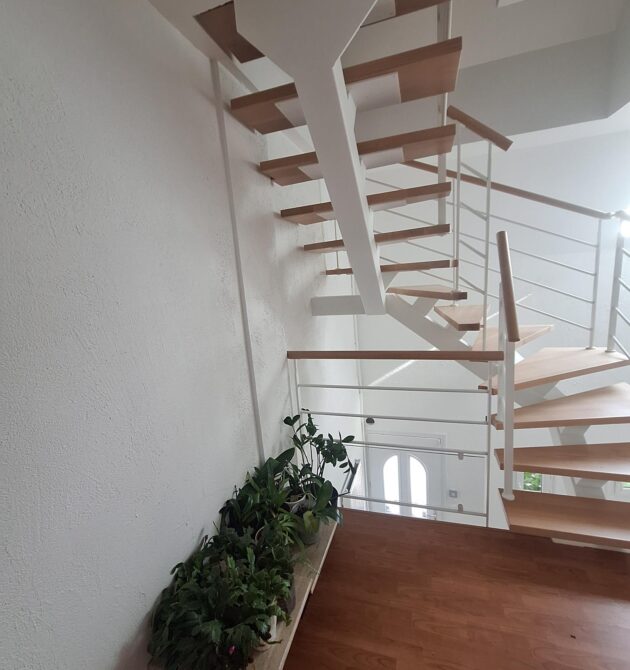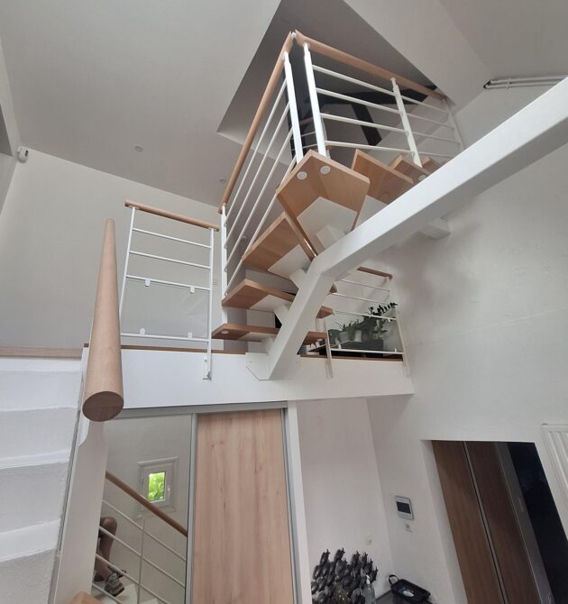 Lignes fluides et équilibre des matières pour cet escalier modèle LIPS, réalisé en hêtre massif vernis incolore. Son garde-corps en métal thermolaqué blanc RAL 9016 s’intègre avec élégance à l’ensemble, créant un contraste doux. Un design sur mesure, qui conjugue chaleur du bois et finesse du métal pour un rendu à la fois chaleureux et contemporain.