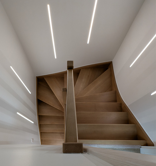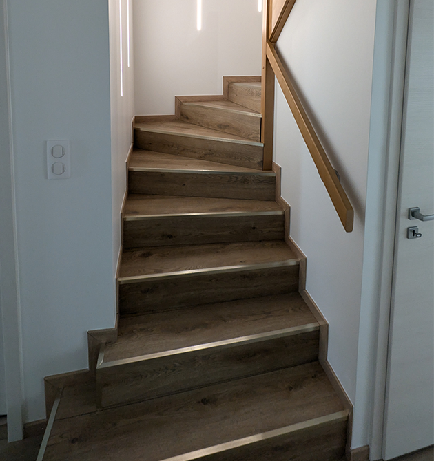 Les lumières LED murales intégrées au mur renforce l’ambiance moderne et chaleureuse de l’escalier 💡