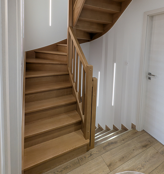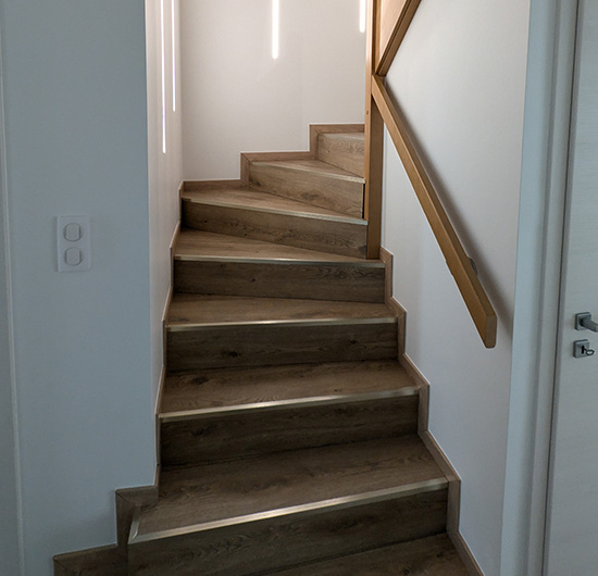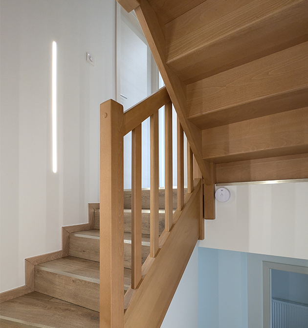Pose d’un escalier et d’une main courante en hêtre massif par la Menuiserie Page, notre menuisier conseil et partenaire Skali près de Pontarlier.