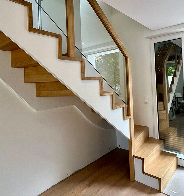 Cet escalier sur-mesure se compose d’une structure crémaillère décalée avec finition RAL 9016 et de marches et poteaux en chêne massif.