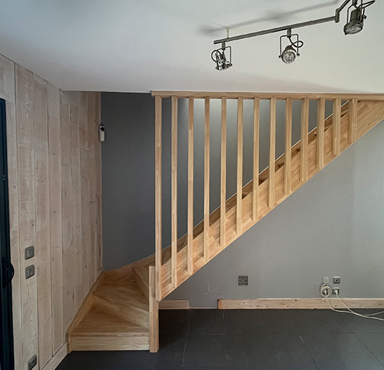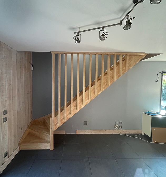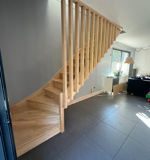 Une structure limon avec contremarches et un garde-corps en claustra bois.