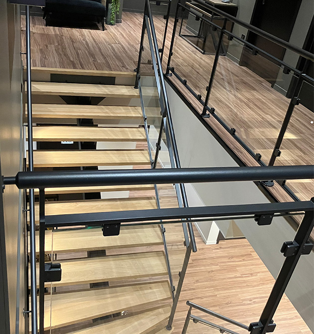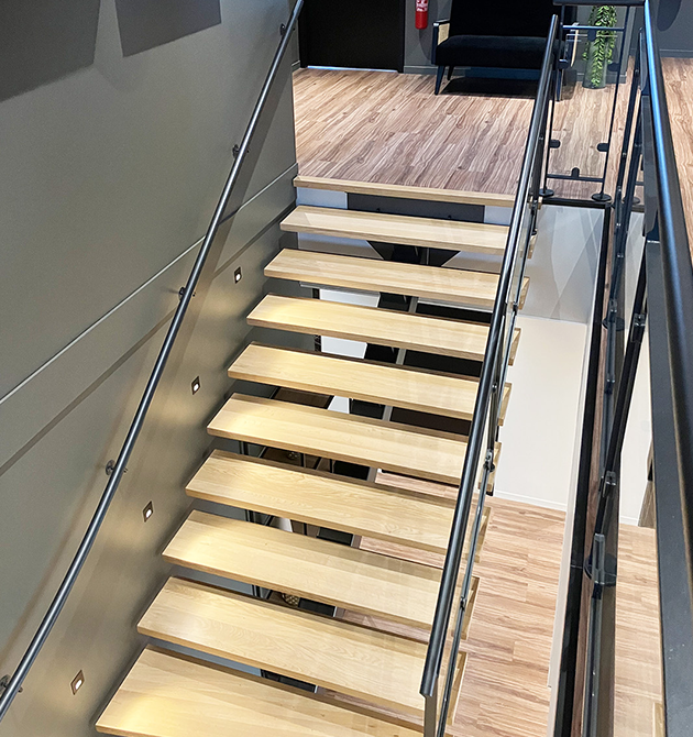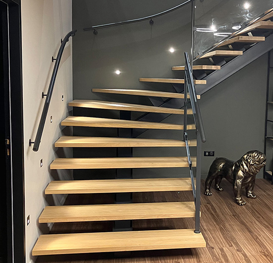 Essence de bois : des marches en chêne massif avec finition vernis incolore.