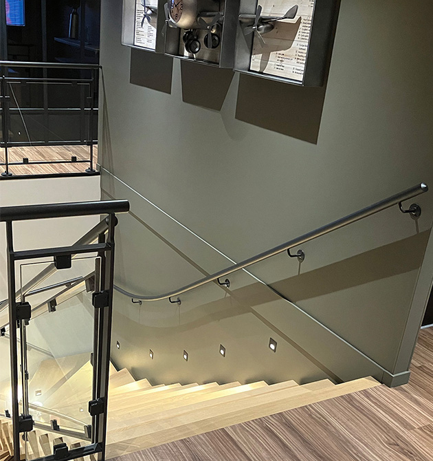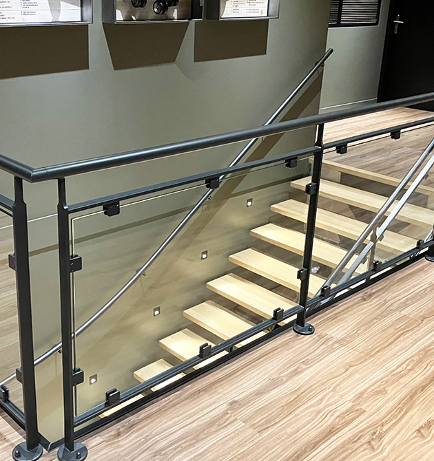 Garde-corps rampant : une main courante ronde en métal thermolaqué (RAL 2100S) avec un soubassement avec verre sur pinces.