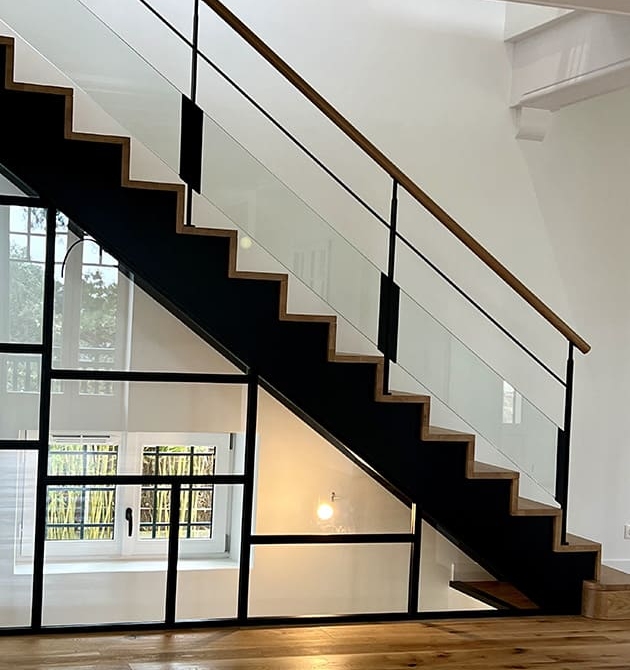 – Garde-corps rampant en verre avec vis thermolaquées pour une finition impeccable, poteaux plats, combinant robustesse et design minimaliste.