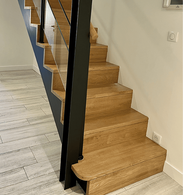 – Marches avec contremarches, sans nez de marche pour un style épuré.– Marche de départ arrondie, élégante et accueillante.