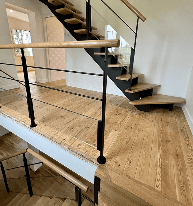 Découvrez ces trois escaliers conçus en chêne massif et sublimés par une finition en vernis incolore, mettant en valeur la beauté naturelle du bois. Chaque escalier présente des détails techniques et esthétiques qui en font de véritables pièces maîtresses d’architecture intérieure.